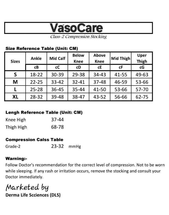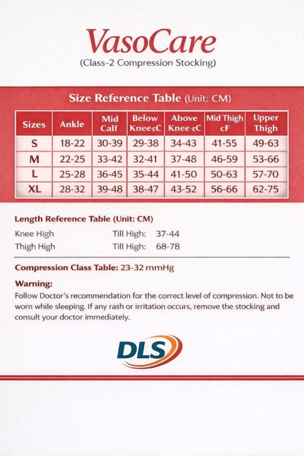 VasoCare Grade 2 compression stockings (Class 2, typically 23-32 mmHg of pressure) are medical devices used for managing moderate to severe venous conditions. These require a doctor’s recommendation to ensure proper fitting and suitability for the specific condition.